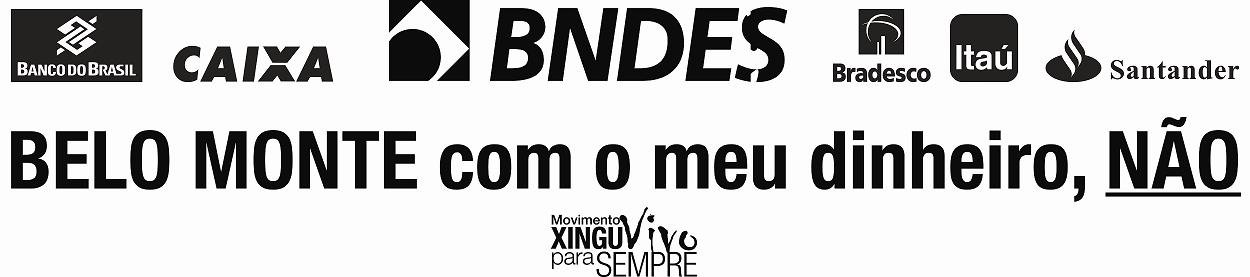 Mas é importante frisar que sem dinheiro Belo Monte não sai. Portanto, vamos dizer aos bancos públicos e privados, que Belo Monte, com meu dinheiro NÃO!! Com muitos cartazes e faixas nas ruas focando os bancos, podemos dar um recado claro e forte.