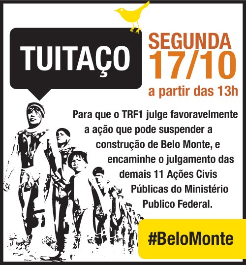 Se você quer unir sua voz aos indignados contra esse projeto que não visa o desenvolvimento real brasileiro e ainda por cima traz consigo uma imensa lista de crimes contra os direitos humanos e o meio ambiente, pode participar do protesto online. O tuitaço acontece dia 17, a partir das 13h, para pedir que o TRF-1 seja favorável à ACP e que julgue as demais. Usaremos a #BeloMonte. Participe! Indigne-se! (clique aqui para baixar a imagem).
