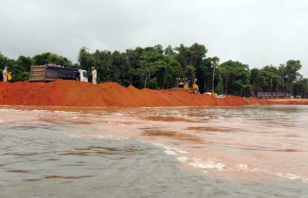 “A obra começou logo depois do ano novo”, contou um barqueiro que trafega pela área. Contudo, segundo ele, a primeira tentativa de erguer a barreira provisória, feita apenas com terra, foi levada pela correnteza. “Agora, eles também estão usando cascalho, pra ver se segura”, comentou. Também a ilha em frente à obra, onde passará o barramento, já está sendo desmatada. A autorização para supressão de vegetação foi dada pelo Ibama e prevê a derrubada de 5 mil hectares de floresta.