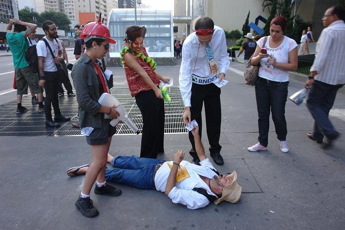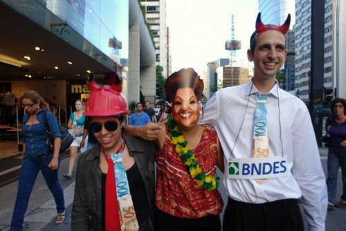Pequeno mas aguerrido, o grupo de ativistas independentes que organizou um protesto em frente ao prédio da Eletronorte na Avenida Paulista, em São Paulo, panfletou contra Belo Monte mascarado de Dilma e vestido de BNDES e Camargo Correia.