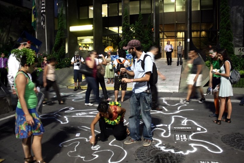 Os cadáveres, colocados na frente do prédio, na calçada da Av.Paulista, foram marcados com tinta branca, em memória e protesto contra a construção da Usina de Belo Monte. Na avaliação dos ativistas, o ato foi bastante efetivo. “Muitas pessoas dialogaram com o movimento, e algumas até se integraram à distribuição dos panfletos e na conversa com os que passavam”.