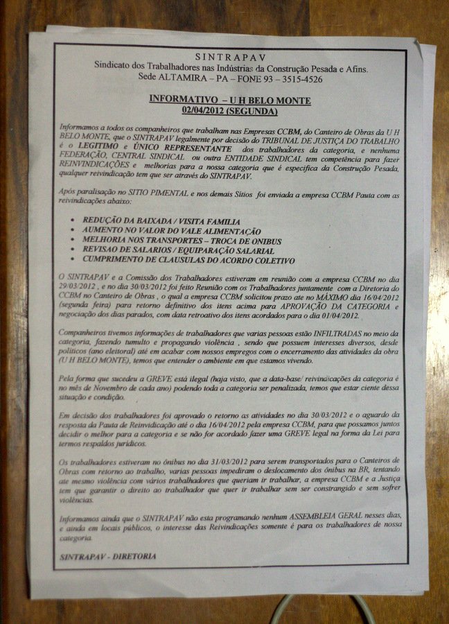 “Fomos traídos pelo sindicato”, diz Francinildo. Por conta disso, os trabalhadores lançaram um abaixo-assinado, propondo a desfiliação da categoria à entidade. “Todo mês o sindicato desconta 30 reais de todo mundo, sem a gente ter escolhido isso”. Seguindo em cálculo, a arrecadação anual do sindicato apenas com Belo Monte (o sindicato é estadual) com a contribuição confederativa ou asssistencial, seria de cerca de 2,5 milhões de reais – considerando um universo de 7 mil trabalhadores diretos que tem descontados cerca de 30 reais por mês de suas folhas de pagamento para o Sintrapav. No pico da obra, com 20 mil trabalhadores, a arrecadação será de cerca de 7,2 milhões. Fora o imposto sindical anual, que é dividido com a Federação Nacional dos Trabalhadores da Construção Pesada (FENATRACOP), a Confederação, a Força Sindical e o governo.