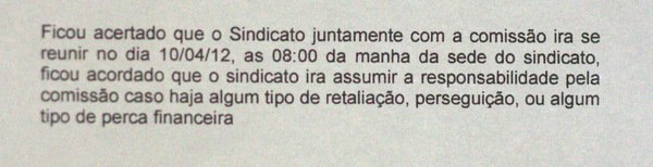 “Não temos certeza de nada. De hoje em diante, dia 3 de abril de 2012, não temos garantia de nada. E esse papel do sindicato a gente não acredita que vai nos segurar. Da outra vez, não ajudaram a reverter as quitas… Sabemos que tem pelo menos um na lista, e também falaram o nome de outro”, concluem.