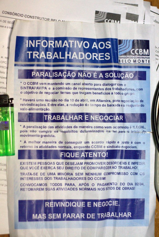 Na manhã de segunda-feira, dia 2, o consórcio distribuiu aos funcionários um informativo dizendo que “paralisação não é a solução”, que “a melhor maneira de conseguir um acordo rápido e justo é com o retorno às atividades normais, enquanto CCBM e sindicato negociam” e que “existem pessoas que desejam promover desordens e impedir que você exerça seu direito de comparecer ao trabalho. Trata-se de uma minoria sem nenhum compromisso com os interesses dos trabalhadores do CCBM. Convocamos todos para, após o pagamento do dia 2 de abril, retomarem suas atividades normais nos sítios de obras” [nota do repórter: então, ainda havia greve].