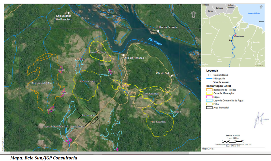 Mapa do projeto Belo Sun sobreposto a territórios tradicionais da Volta Grande do Xingu e ao PA Ressaca